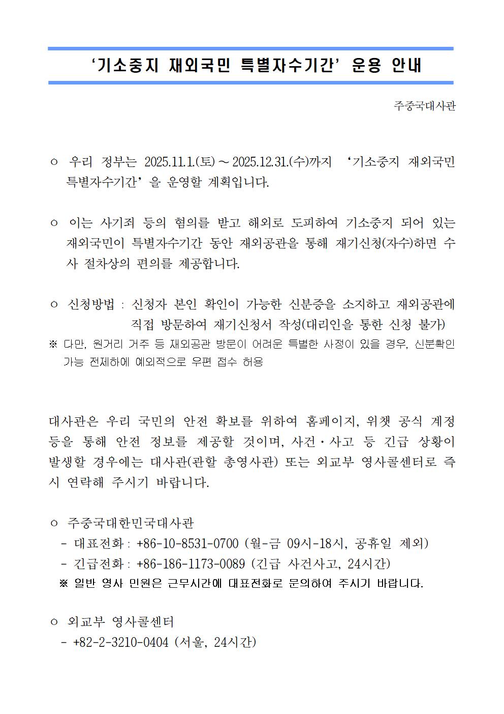 2025년 기소중지 재외국민 특별자수시간 운영안내
