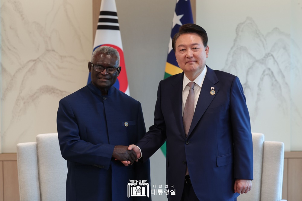 윤석열 대통령은 어제의 5개 태평양도서국 정상들과의 양자 회담에 이어 오늘(5. 29, 월) 오전 마크 브라운(Mark Brown) 쿡제도 총리, 데이비드 카부아(David Kabua) 마셜제도 대통령, 머내시 소가바레(Manasseh Sogavare) 솔로몬제도 총리, 달튼 타겔라기(Dalton Tagelagi) 니우에 총리, 수랭걸 휩스(Surangel Whipps Jr.) 팔라우 대통령과 정상회담을 실시했습니다.